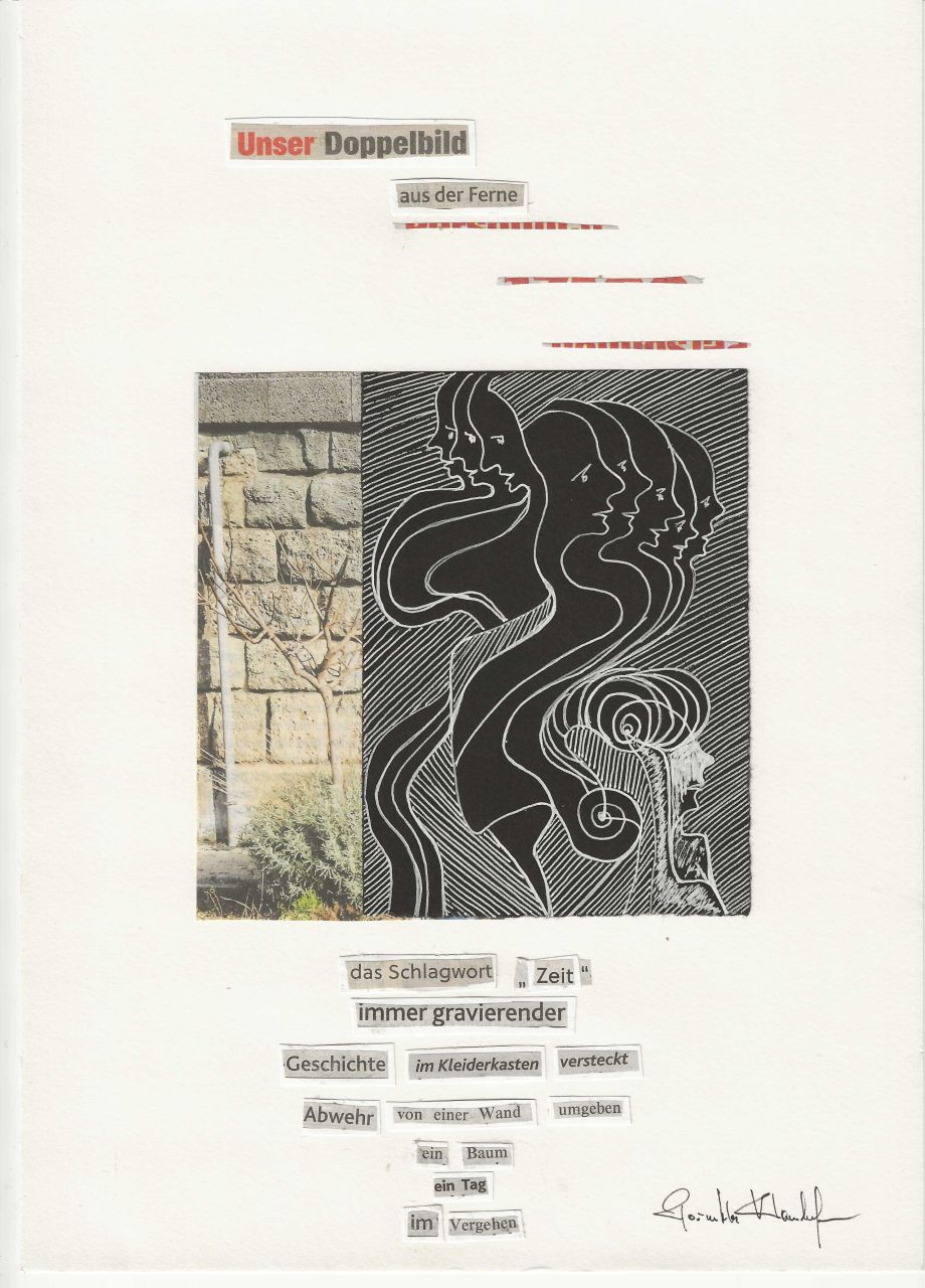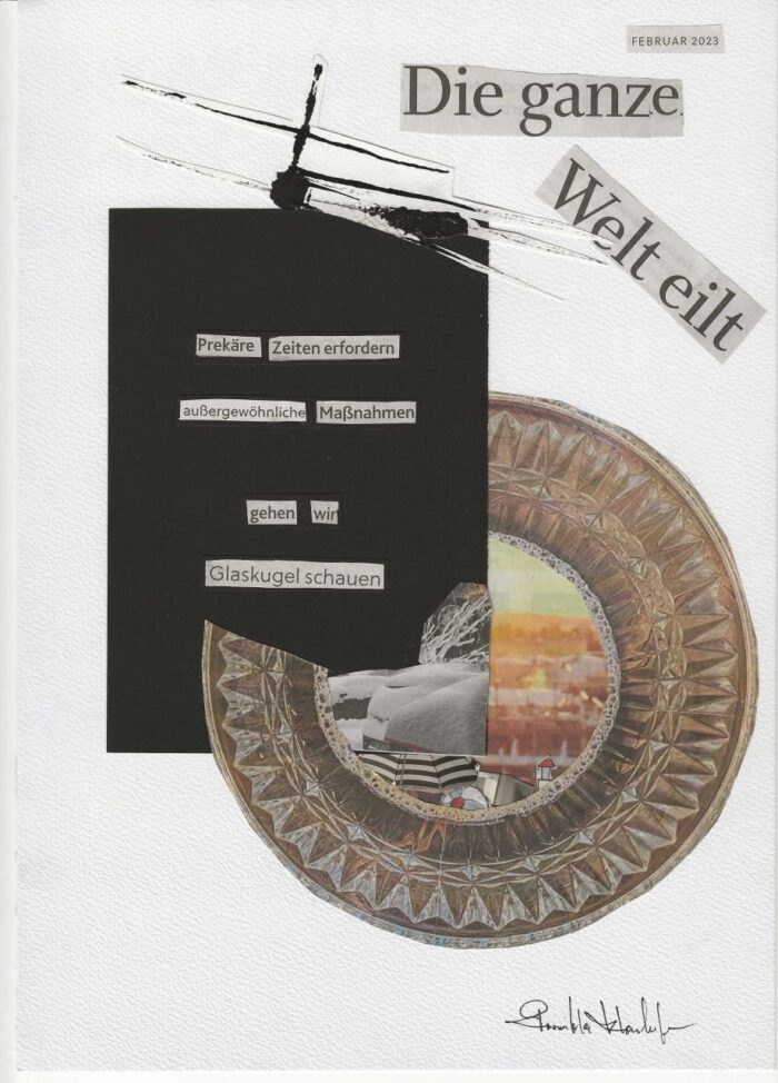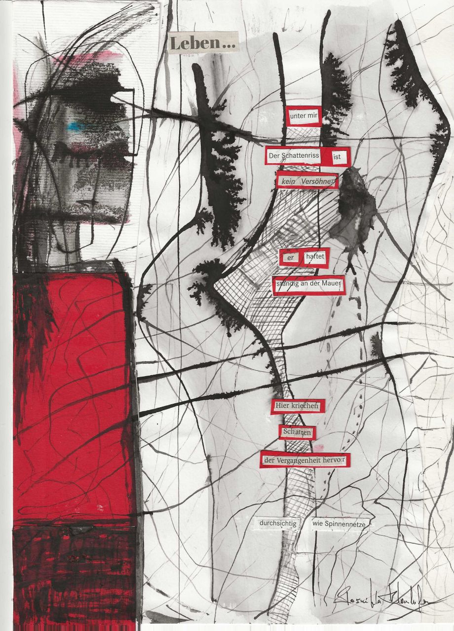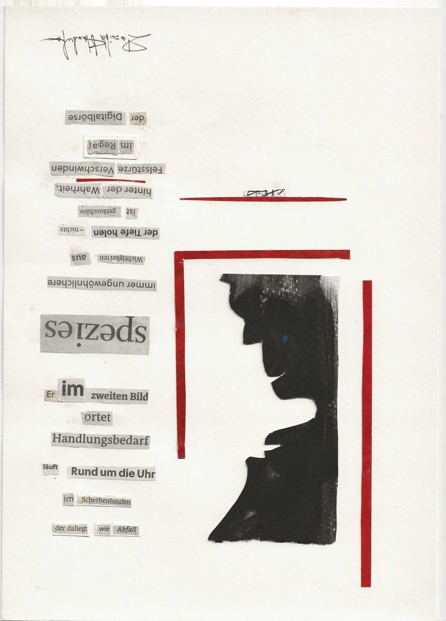 Alles beginnt beim Suchen und Finden: Ich schneide Silben, Wörter oder ganze Sätze aus Tageszeitungen und montiere daraus Nachrichten, ergänze und „befestige“ sie mit eigenen Grafiken, ausgeschnittenen oder gerissenen Figuren. Daraus wird eine Botschaft, eine Auflehnung, eine Andeutung, auch ein Fremdes, woher wir kommen und wohin wir gehen.